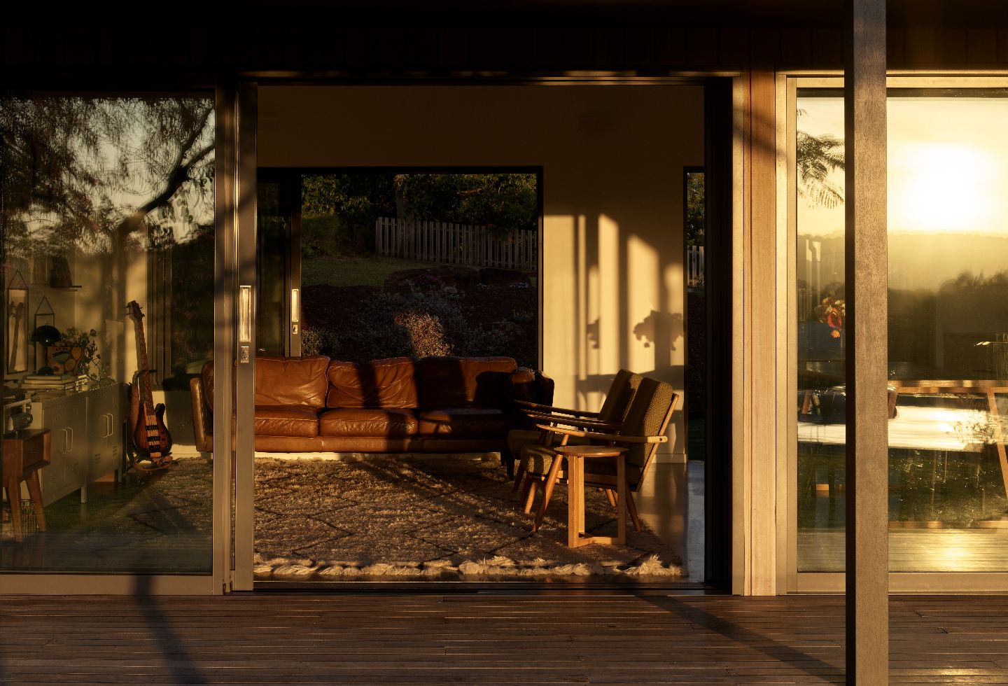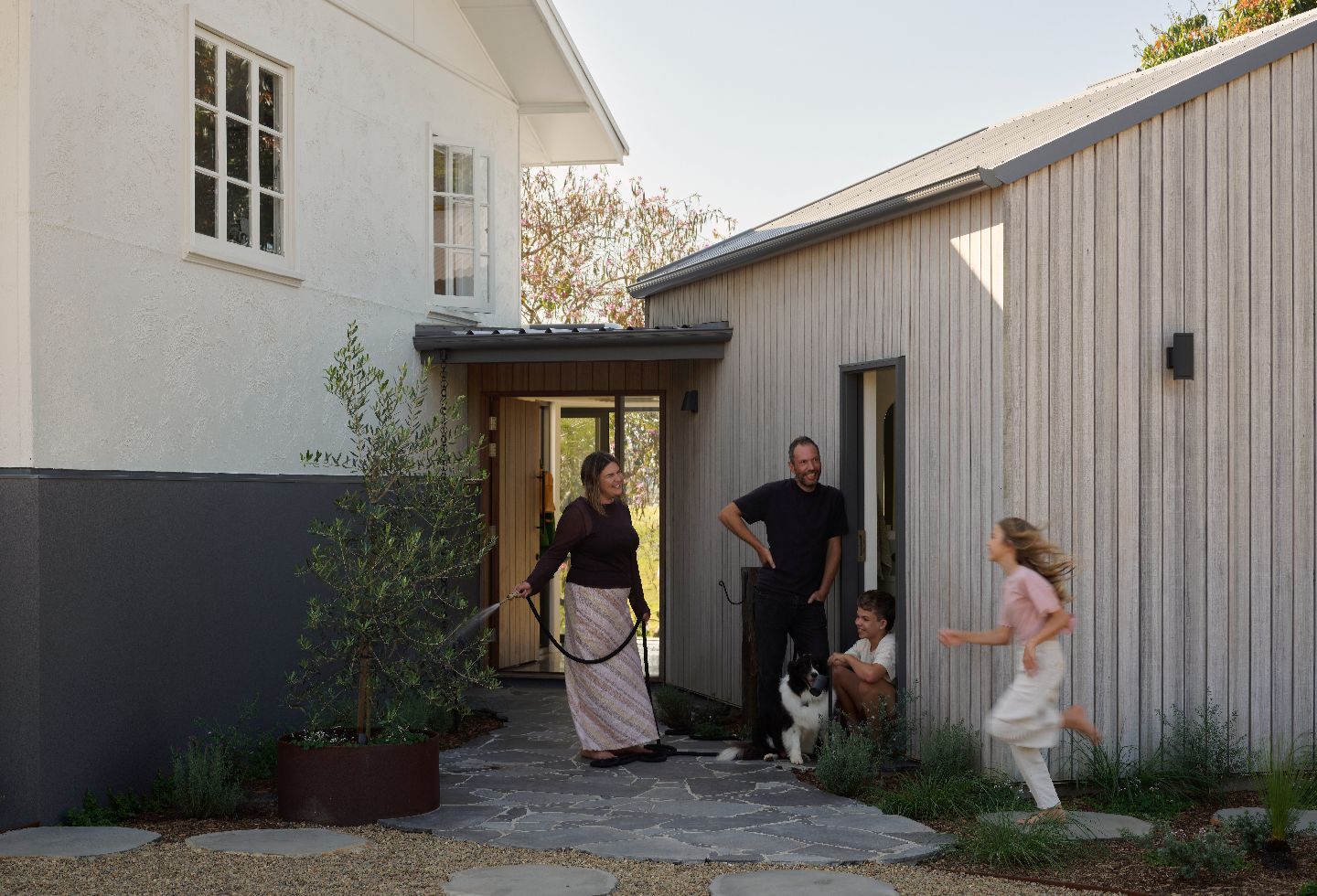 A gable-roofed addition links to the original home via a multi-use corridor that traverses the exterior, leading onto a verandah with sliding doors to blur the threshold between inside and out. This transitional walkway became both a design gesture and a pragmatic solution, allowing the architects to preserve the old undercroft without disturbing asbestos materials and keeping the budget in check.