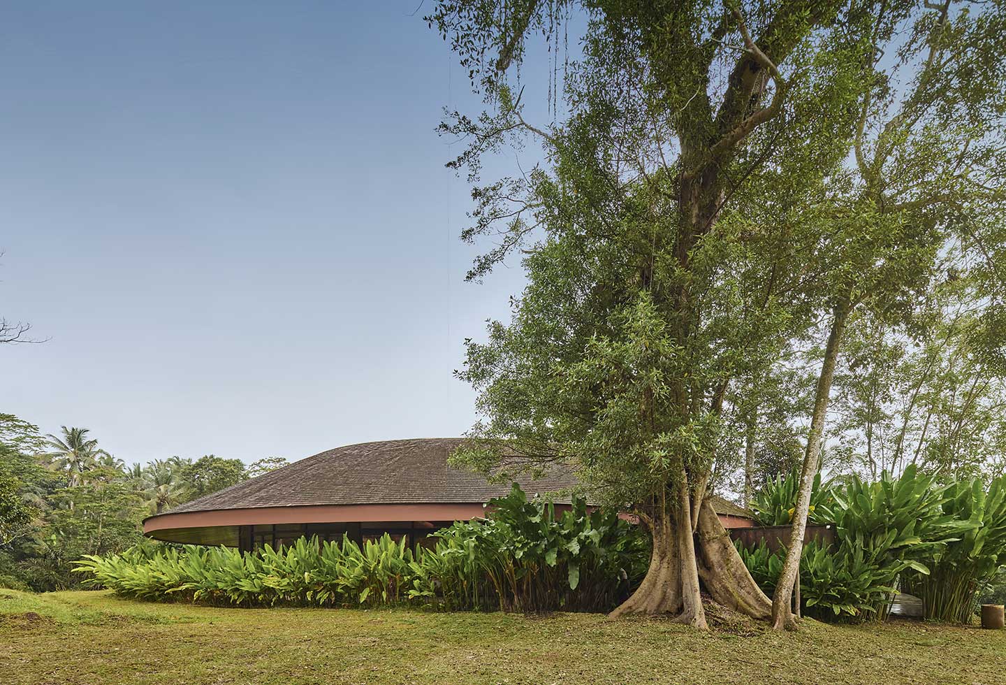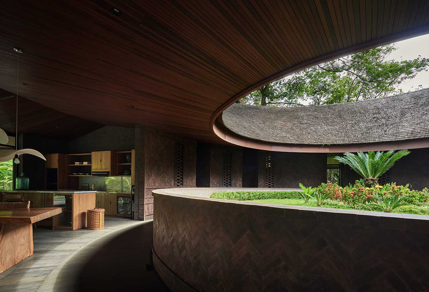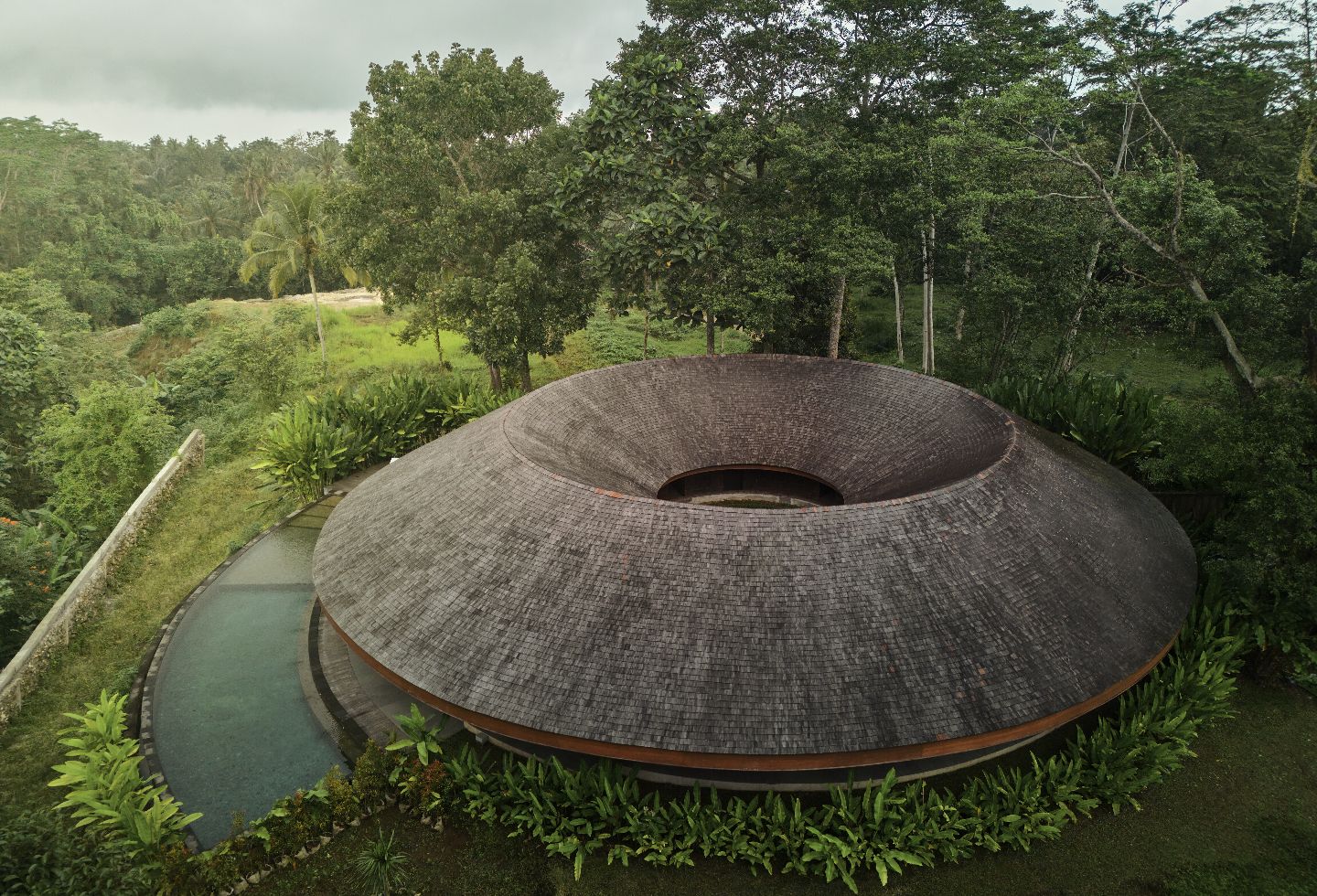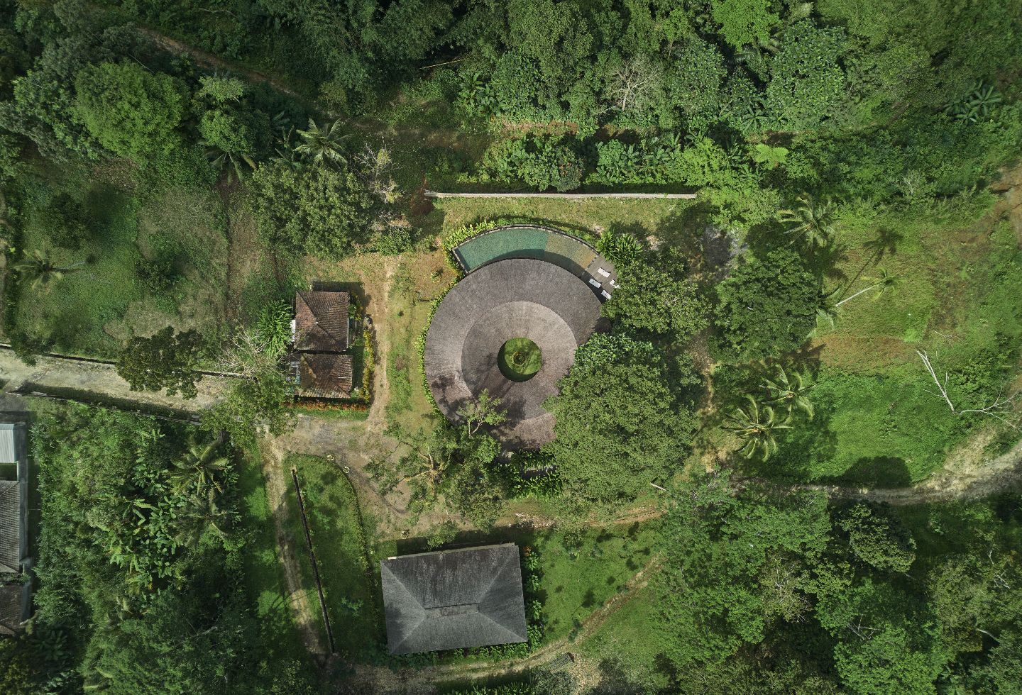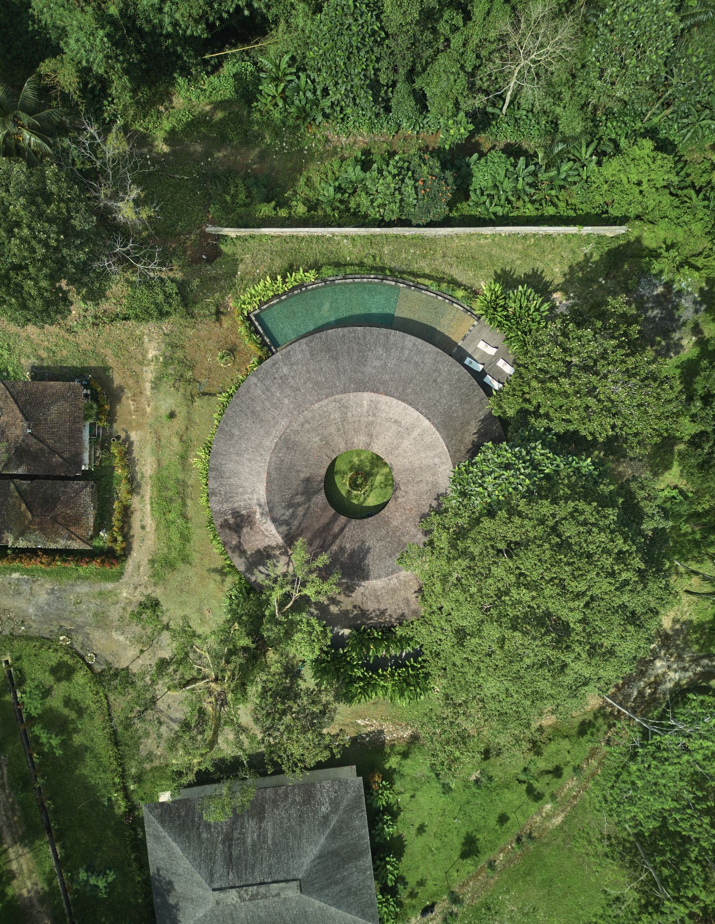Villa Omah Prana is a circular home in the highlands of Payangan, Bali. The project follows one clear idea: a ring-shaped plan that places all rooms along the perimeter, orienting them toward the surrounding landscape. The living room opens up to both the courtyard and the exterior, creating a fluid transition, while the more private spaces — bedrooms and enclosed areas — remain air-conditioned and sheltered.