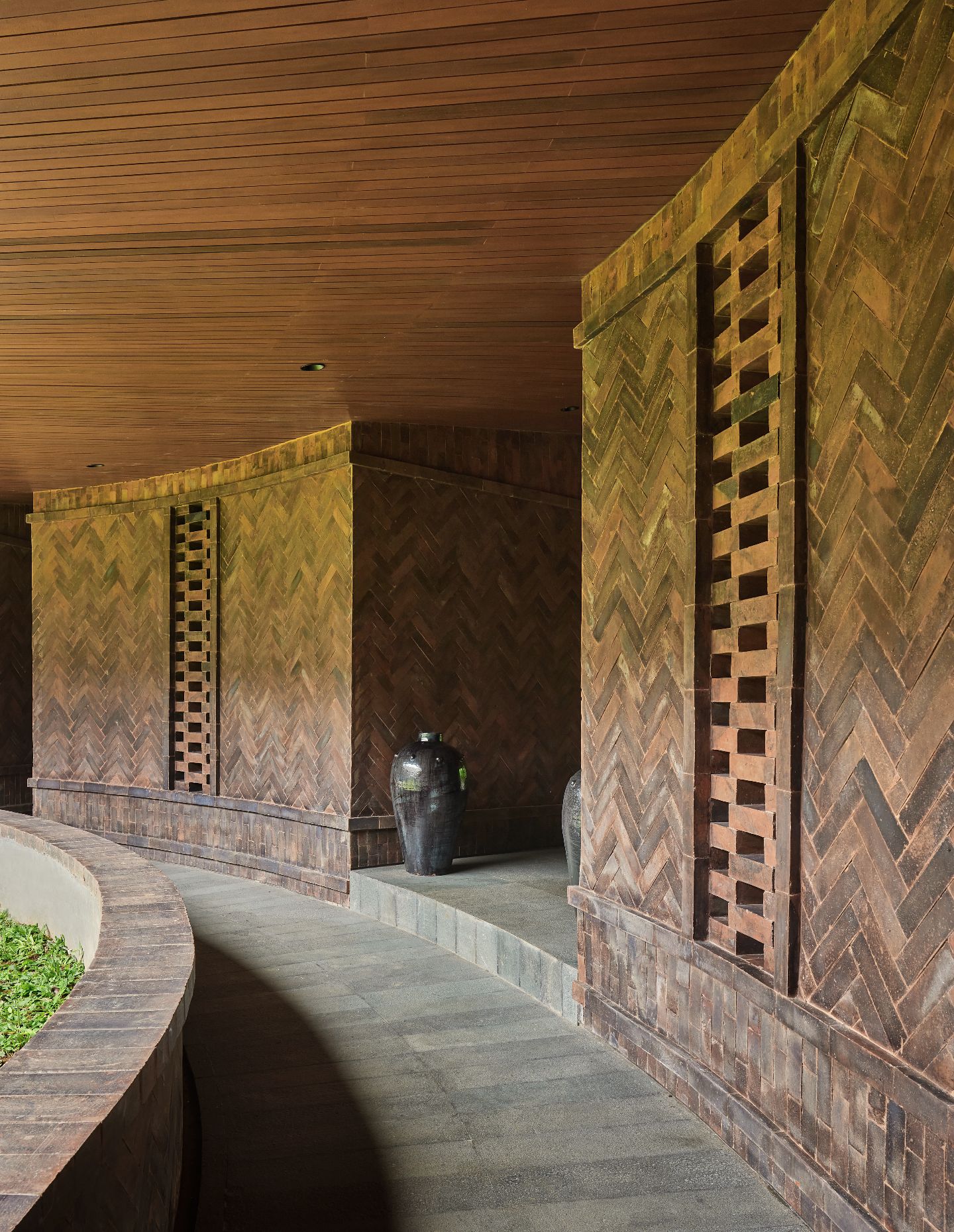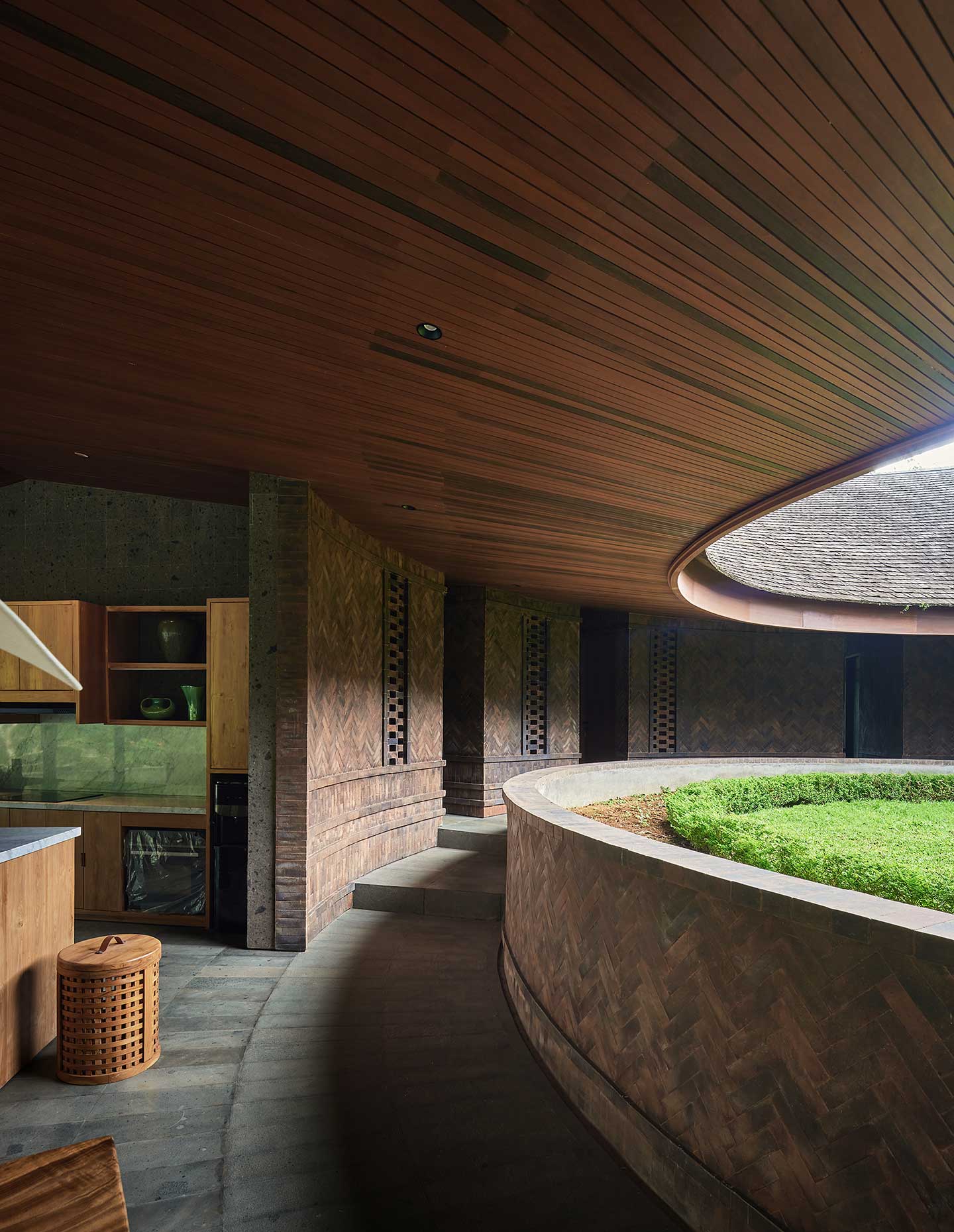 Materiality and surface treatment draw from Bali’s tradition of weaving. Brickwork laid in herringbone patterns, interlaced wall textures and subtle geometric motifs reinterpret local craft in a contemporary way. These details add tactility and depth without overwhelming the architecture. The house invites close inspection; it is rich in detail but remains calm and grounded.