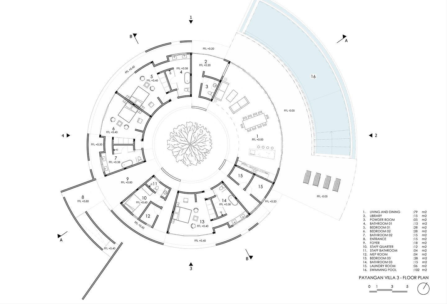 The entire building is organised around a single central point. Concentric circles define the plan, the pool, the pathways and many built-in elements. This shared centre gives the home a quiet sense of order. The geometry behaves almost like ripples expanding from one moment of impact — simple, readable and consistent.