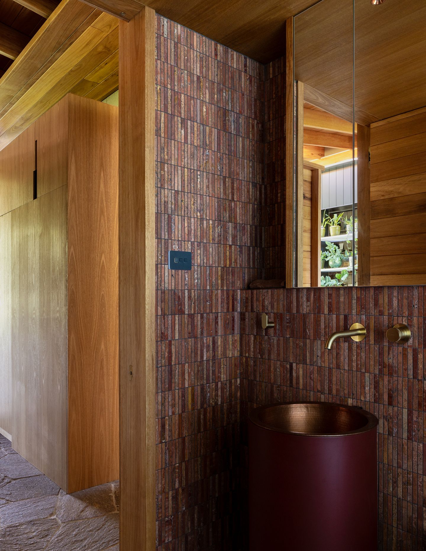 Bold design moments, such as the curved purple sink, brushed nickel detailing and organically hued tiles, operate within an expressive, earthy framework, echoing the ethos of the Sydney School – the regionalist architectural movement from the 1950s and 1980s that prioritised rustic and honest materials. Likewise, the native landscape, a hallmark of this style, permeates the interiors through mirrors and carefully framed viewpoints. Resolved joints and junctions continue to celebrate the raw structure rather than conceal it.