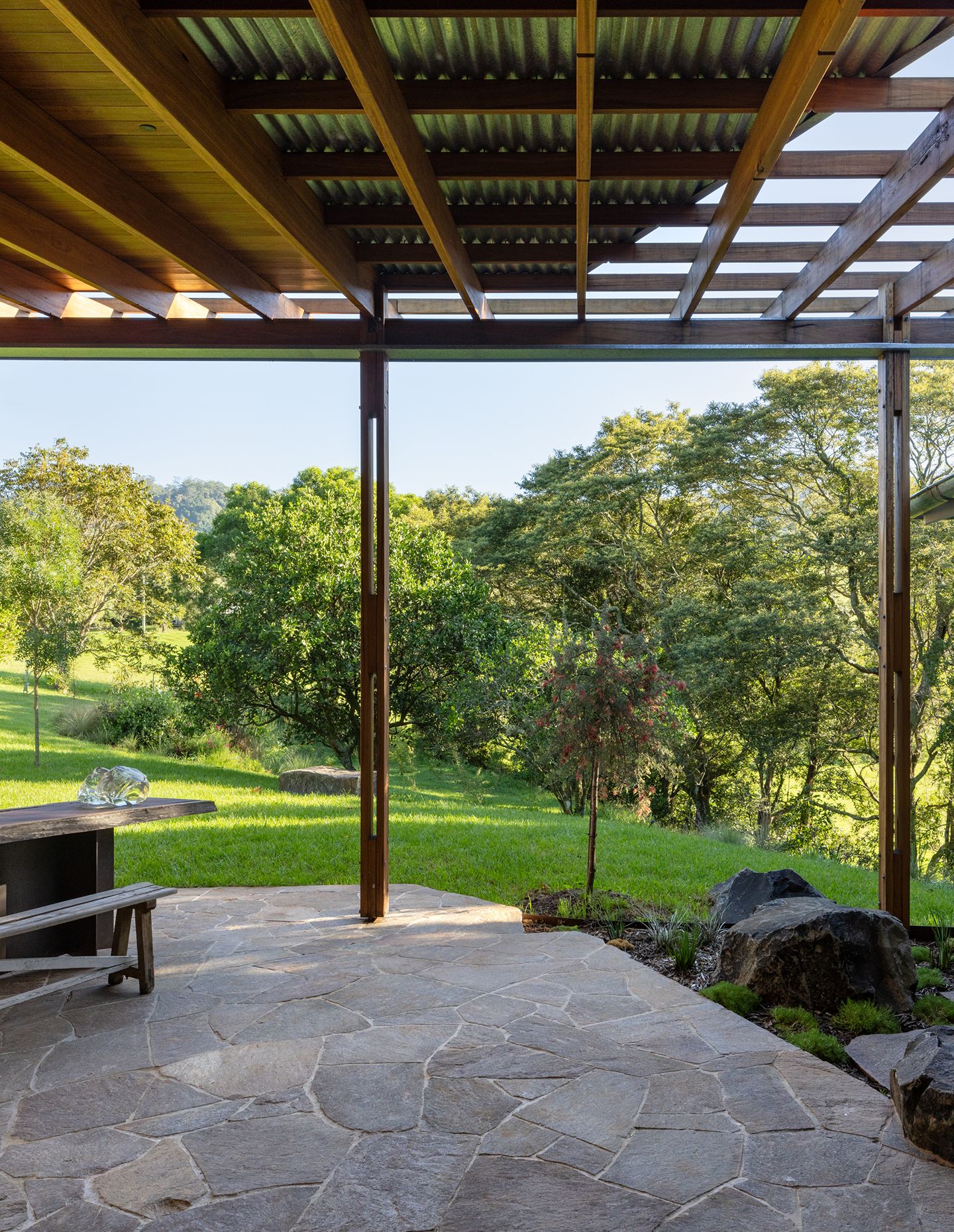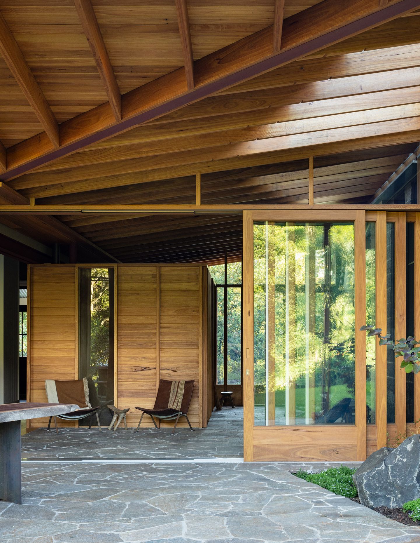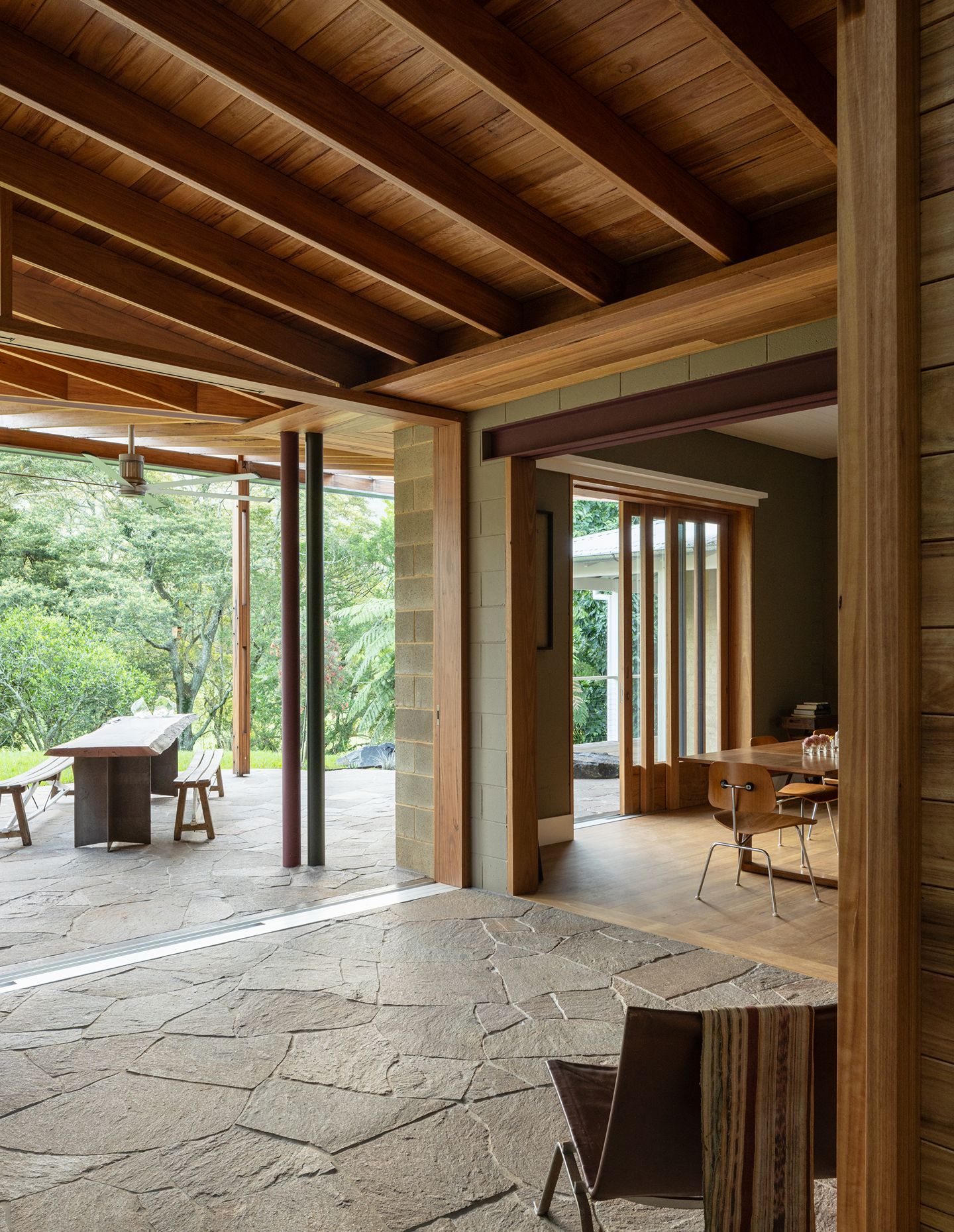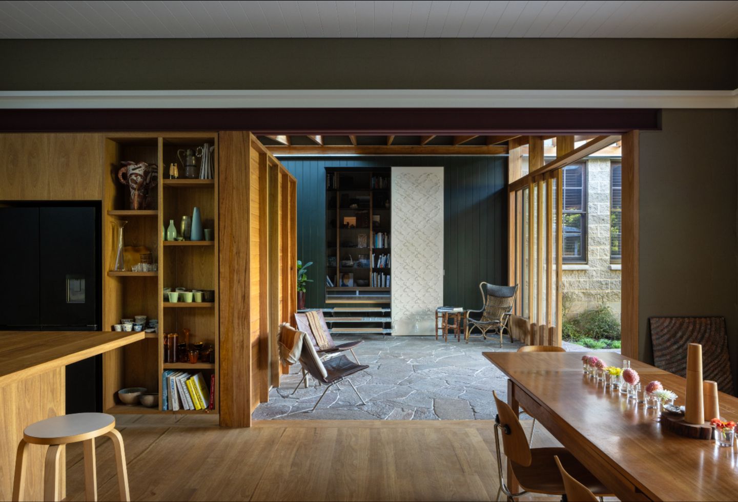 The dwelling is organised around a central courtyard, where interlocking pavilions are wrapped with a traditional ‘lean-to’ verandah. Gently updating the existing building, the verandahs were reinterpreted as the social heart of the home. Additionally, the established gardens, which captured the hearts of the creative husband and wife, are framed by elegant architecture that employs natural, honest materials – timber, stone, and metal.