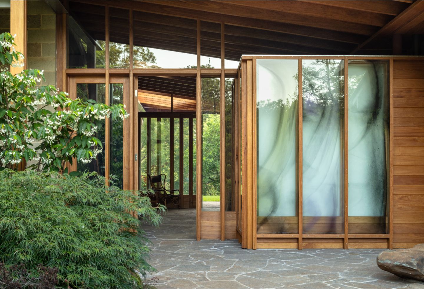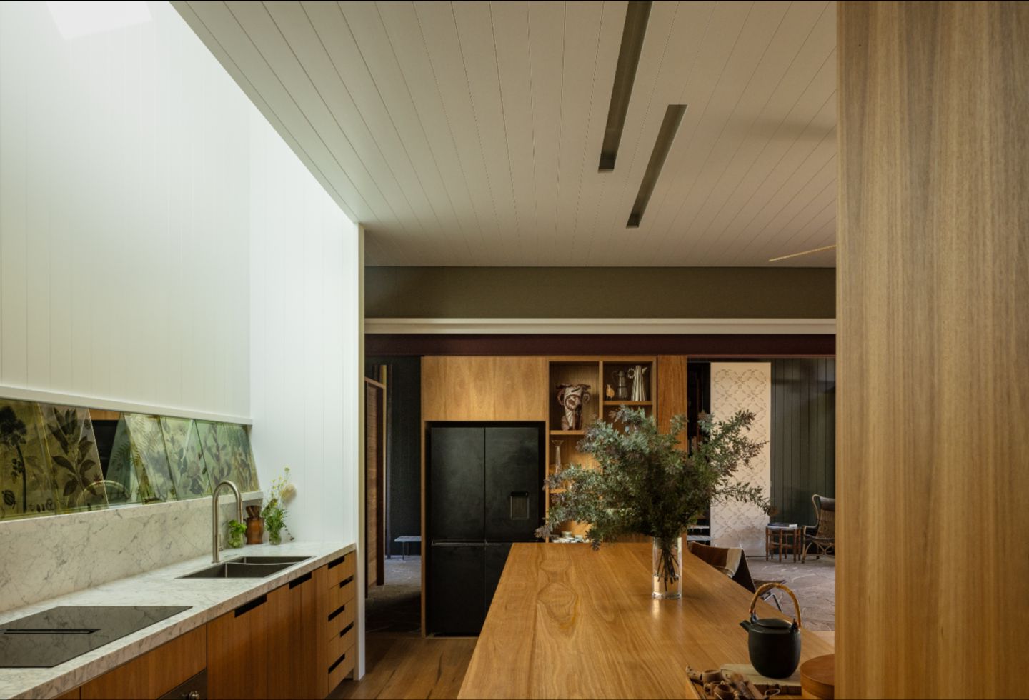 Equally evident is Laurence’s artistic influence – as an acclaimed Australian artist, her work is closely tied to the natural world across photography, sculpture, video, and installation. Her passion for living systems manifests in the flower glass imprints adorning the kitchen backdrop and in the smoky screening of the internal rooms in the covered courtyard.