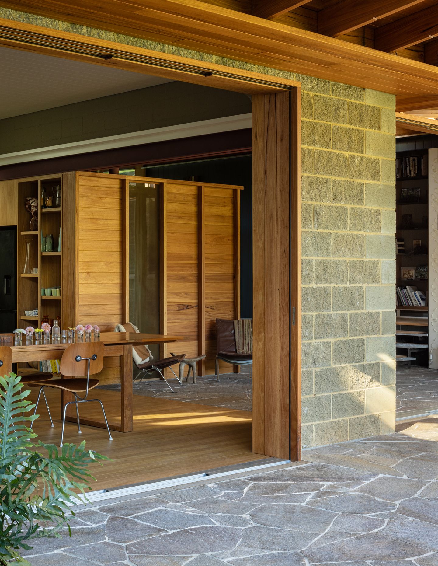 Materiality and layout reinforce the home’s connection to nature. Granite tiles, evoking a riverbed, flow seamlessly between internal and external spaces. Blackbutt ceilings guide breezes, while strategically placed openings frame views of the escarpment and allow natural light to permeate the interiors. The architects approached the design with careful consideration of seasonal sun orientation, calibrating the verandah roof pitch to maximise shade in summer and light in winter.